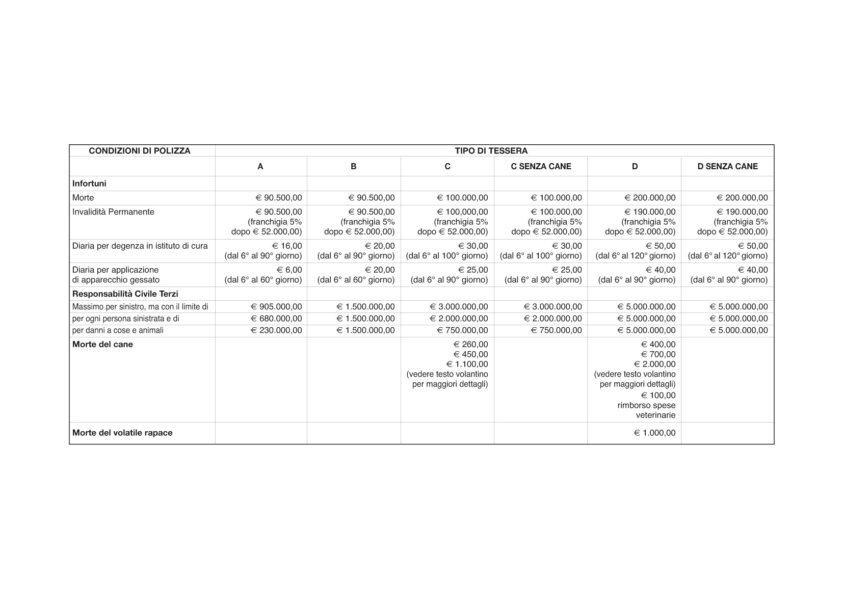 Il rimborso di spese relative a cure veterinarie (tessera D e GG.VV. D) non è previsto in caso di morte del cane, ancorché relativo al medesimo evento. L’assicurazione è operante nell’esercizio dell’attività venatoria e in occasione di: a) allenamento ed addestramento di cani nelle apposite zone e su terreni all’uopo destinati o comunque nelle aree e nei tempi consentiti dalle autorità competenti, anche quando sia consentito lo sparo; b) partecipazioni a gare ed esposizioni cinofile. Le fattispecie assicurate sono: a) attacco di ungulati selvatici a cui sia consentita la caccia in Italia o lupo; b) morsi di vipere e punture di insetti; c) avvelenamento; d) investimento da veicolo; e) annegamento; f) scatti di lacci e tagliole; g) ferite da taglio; h) cadute in burroni o crepacci.